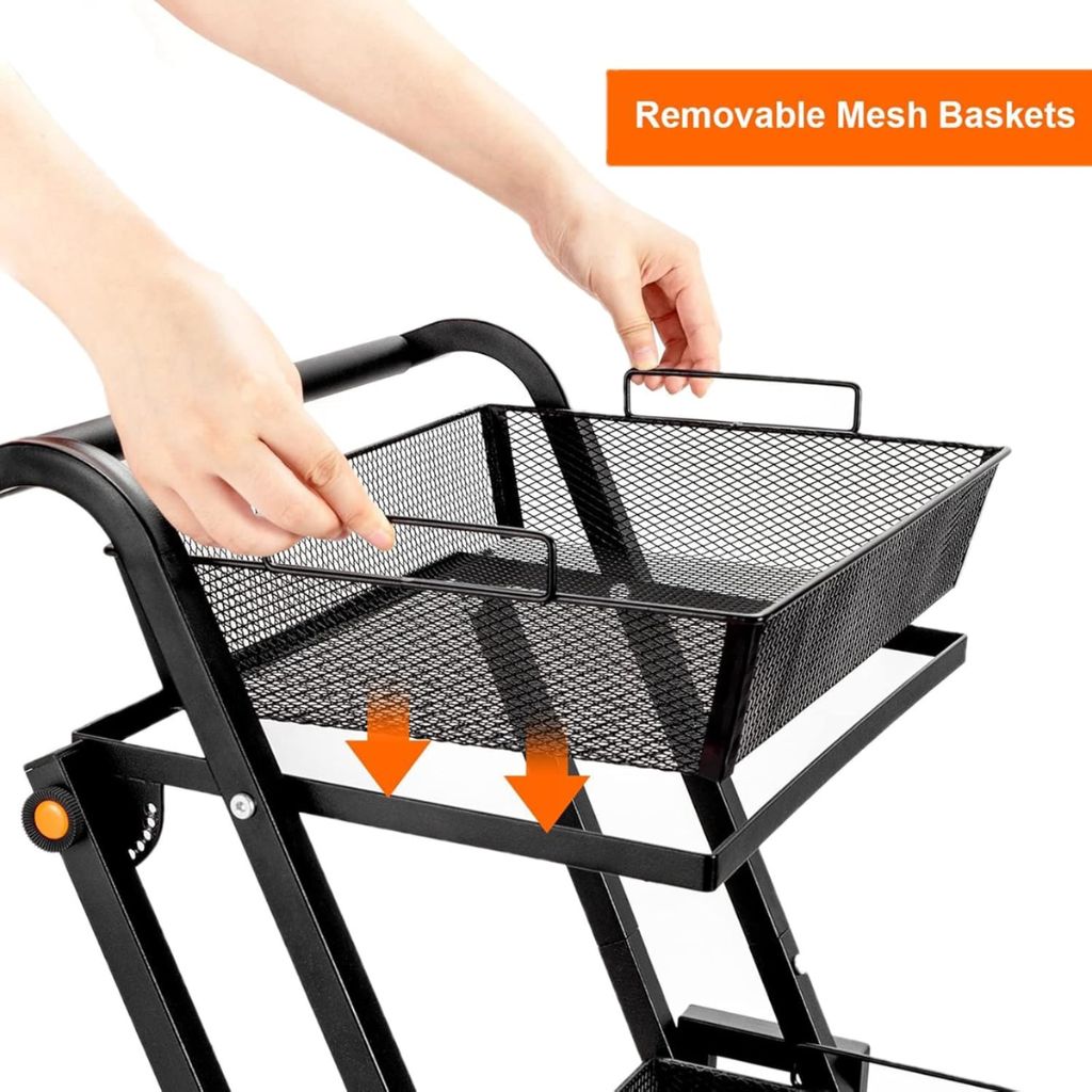Matériau : Métal résistant avec finition noire.Dimensions : 40,69 x 46 x 96,49 cm.Capacité de Charge : Jusqu'à 54,43 kg.Paniers Amovibles : Facilitent le nettoyage et le rangement.Roues Pivotantes : 4 roues pour une mobilité fluide, dont 2 verrouillables pour une stabilité accrue.Design Pliable : Permet un rangement compact lorsqu'il n'est pas utilisé.