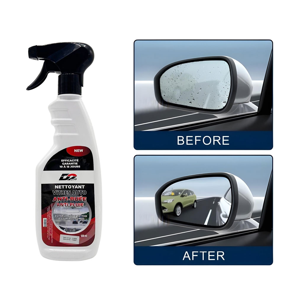 Capacité : 500 mlUtilisation : Conçu pour nettoyer, protéger et améliorer la visibilité des surfaces vitrées de votre véhicule (pare-brise, vitres, rétroviseurs).Propriétés principales :Effet Anti-Pluie : Forme une couche hydrophobe sur la surface, permettant à l’eau de glisser rapidement et offrant une meilleure visibilité sous la pluie.Effet Anti-Buée : Réduit la formation de buée à l’intérieur des vitres, évitant les problèmes de visibilité liés à la condensation.Nettoyage : Élimine efficacement les salissures, les traces d’insectes, la poussière et autres contaminants, laissant une surface propre et brillante.Application : Facile à utiliser grâce à son pulvérisateur. Vaporisez simplement le produit sur la surface et essuyez avec un chiffon propre et sec.